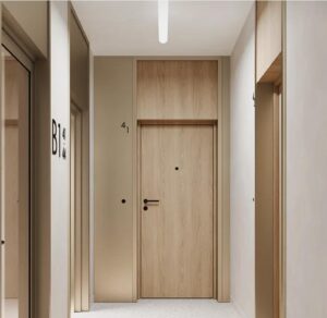 -Hol wejściowy ozdobiony dekoracyjnymi farbami strukturalnymi i eleganckim oświetleniem.