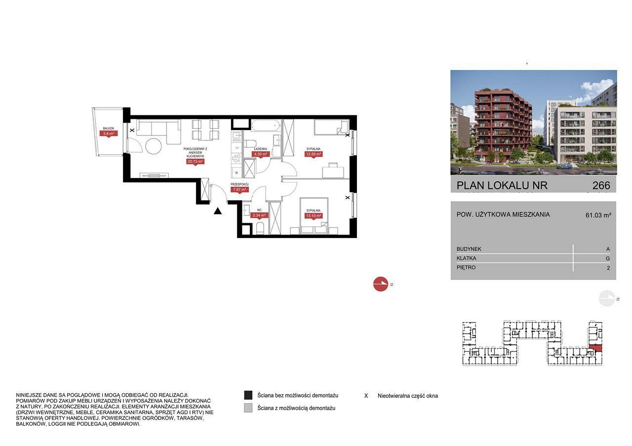 Mieszkanie ma powierzchnię 61,03 m² i składa się z widnego salonu z aneksem kuchennym o powierzchni 20,73 m², głównej sypialni o powierzchni 13,10 m², drugiej sypialni o powierzchni 7,97 m², przedpokoju z miejscem na szafę o powierzchni 7,33 m², dużej łazienki o powierzchni 4,30 m² oraz dodatkowej toalety o powierzchni 2,34 m². Dodatkowo, mieszkanie posiada balkon o powierzchni 3,8 m².