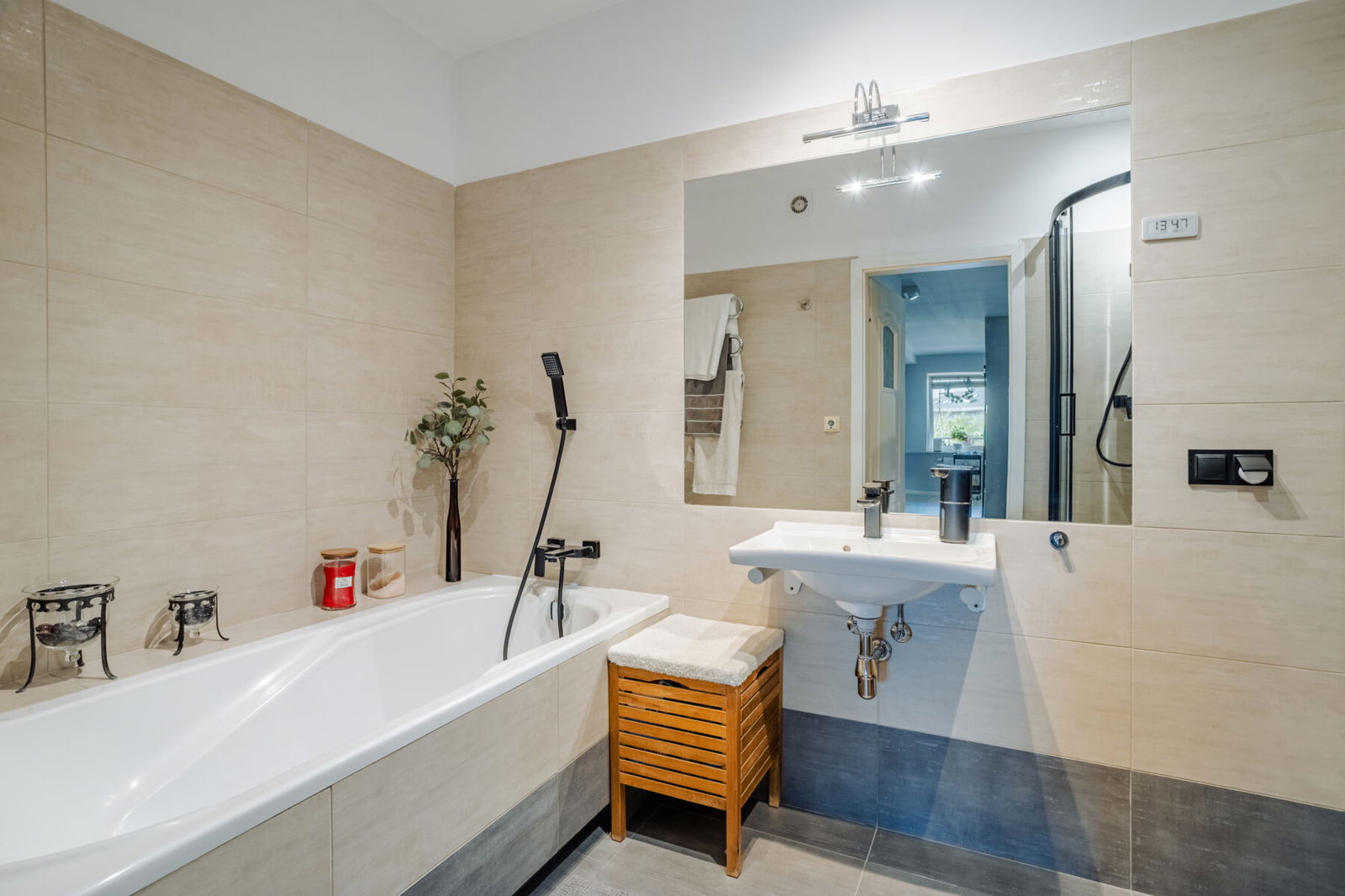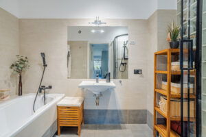 Strefa sanitarna została zaprojektowana z myślą o wygodzie domowników. Nowoczesna łazienka wyposażona jest zarówno w wannę, jak i oddzielny prysznic, a dodatkowo do dyspozycji pozostaje osobna toaleta. W łazience zastosowano estetyczną terakotę i ogrzewanie podłogowe.