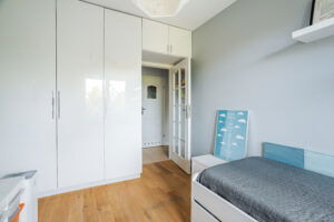 W części prywatnej znajdują się dwie przestronne sypialnie o powierzchni 12 m² i 11 m², które oferują szerokie możliwości aranżacyjne. Na podłogach zastosowano naturalne drewno – w salonie wyjątkowo trwałą i elegancką sucupirę, natomiast w sypialniach klasyczny dąb, podkreślający przytulny charakter wnętrz.