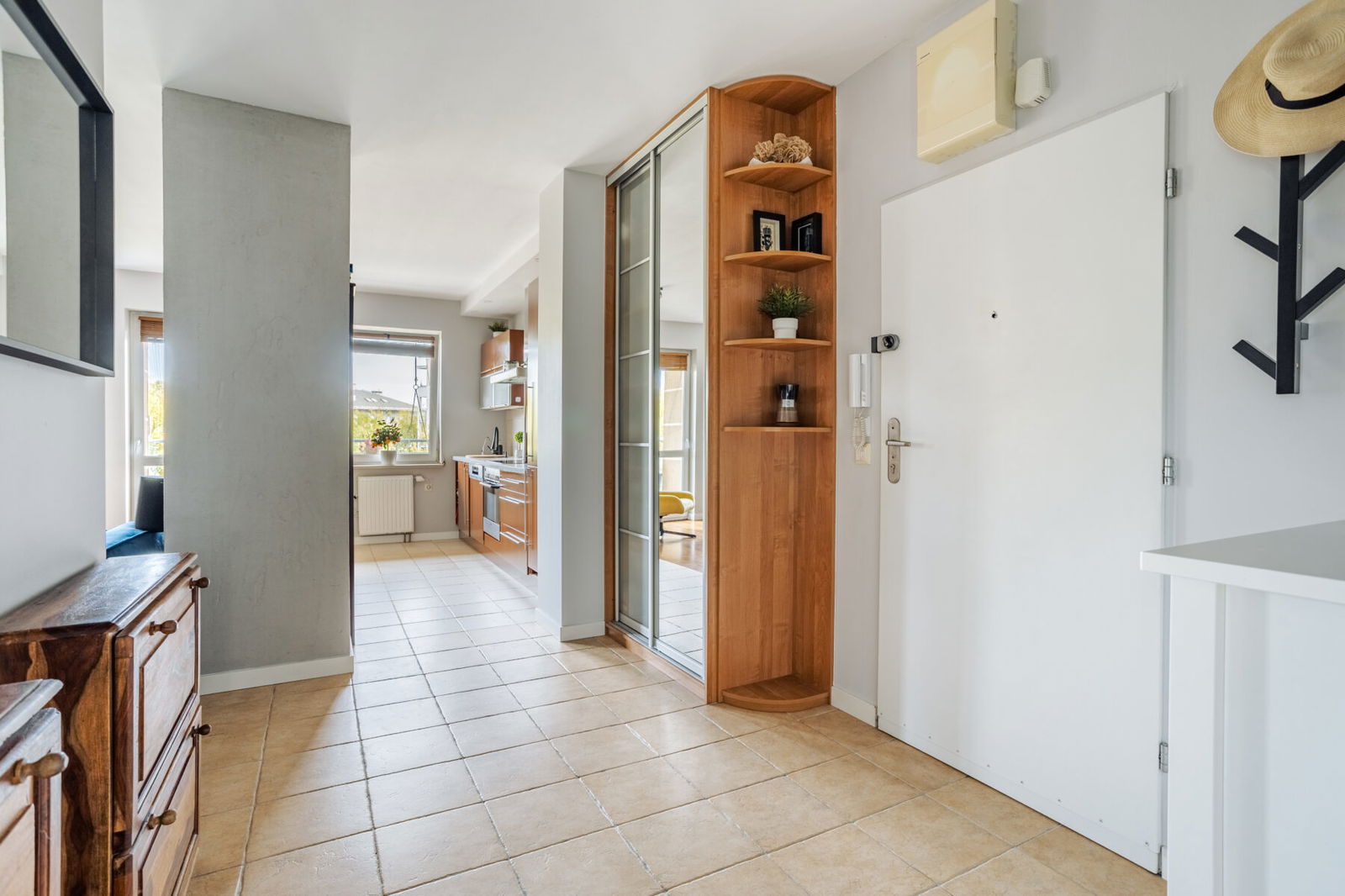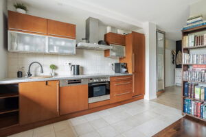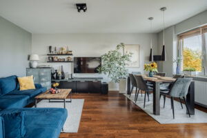 Sercem mieszkania jest przestronny salon o powierzchni 23 m² z wyjściem na loggię – doskonałą do relaksu. Salon płynnie łączy się z widnym aneksem kuchennym (9 m²) z zabudową wykonaną na wymiar. Okna kuchni wychodzą na wschód, zapewniając naturalne światło od porannych godzin.
