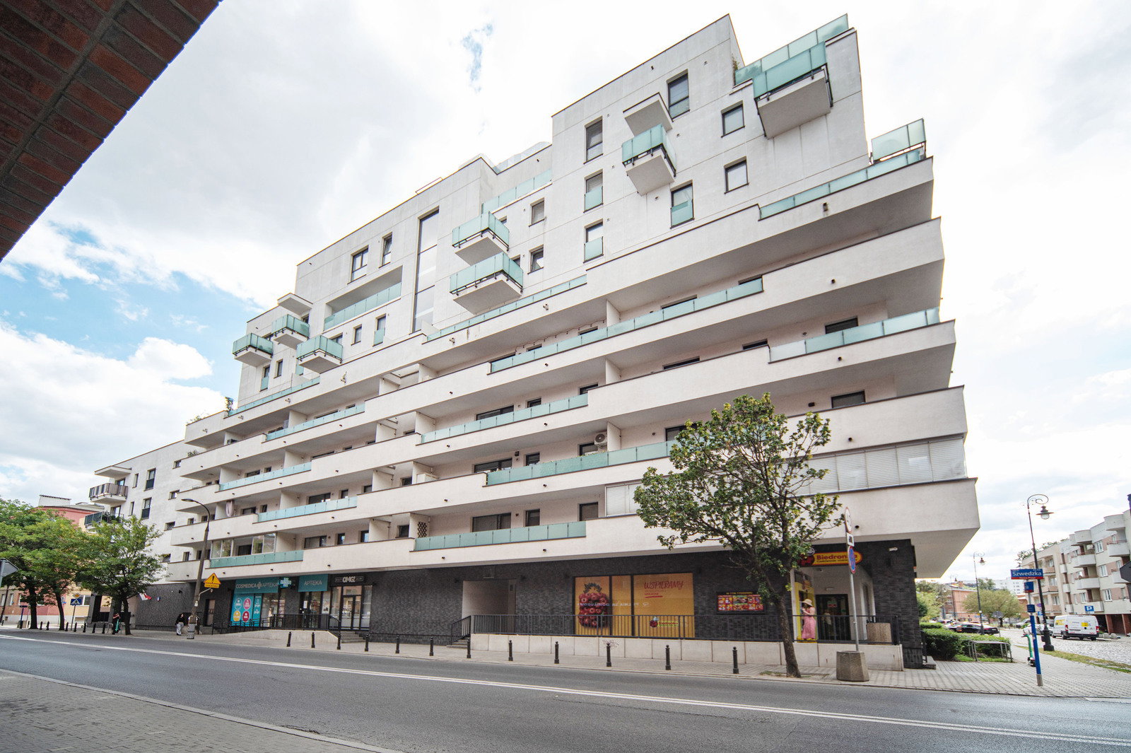 Na parterze budynku market Biedronka, apteka, fryzjer, kosmetyczka.