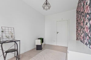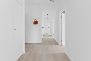 - Przestronne wnętrze: salon z aneksem kuchennym (serce domu do wspólnych spotkań), 4 przytulne sypialnie, 2 łazienki oraz osobna pralnia. Duży przedpokój z zabudowaną szafą ułatwia organizację przestrzeni i zapewnia porządek.