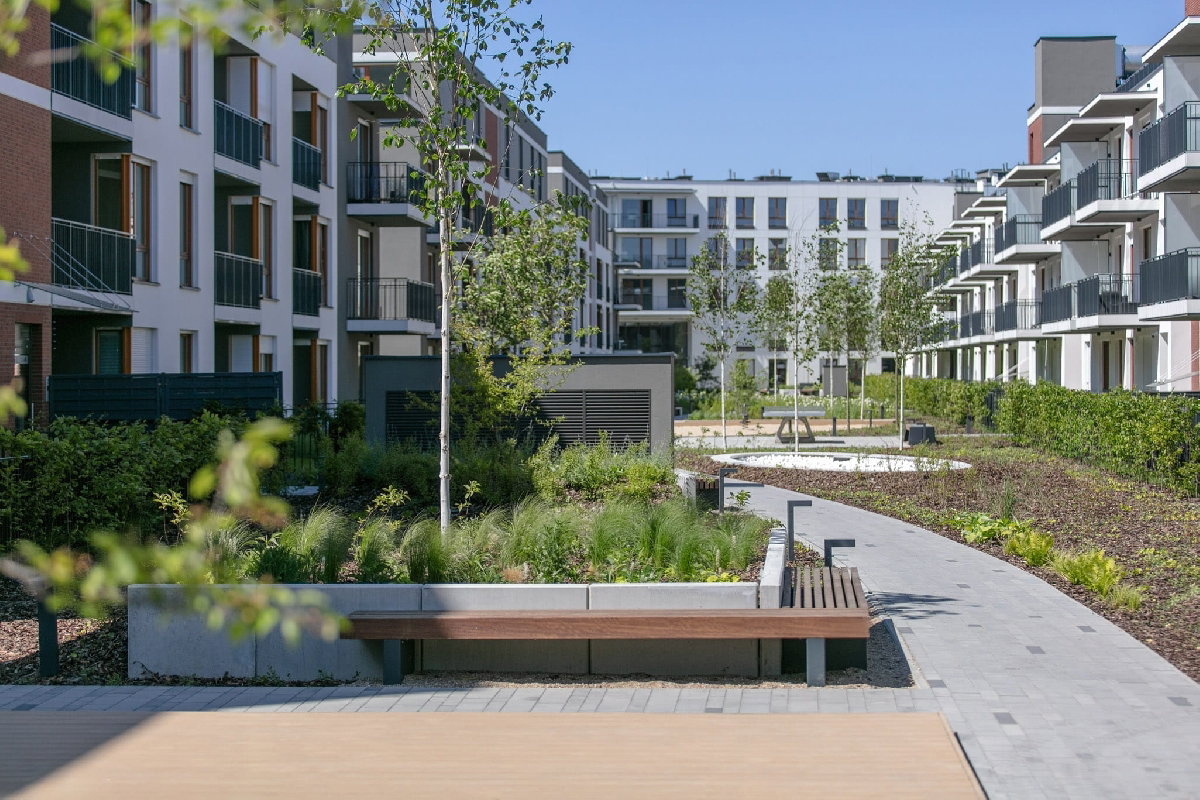 - Zieleń: Starannie zaprojektowane dziedzińce z małą architekturą.