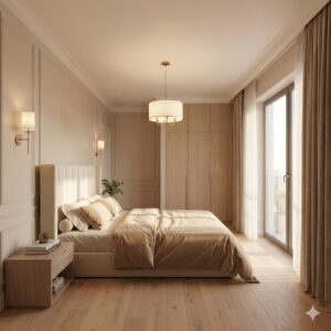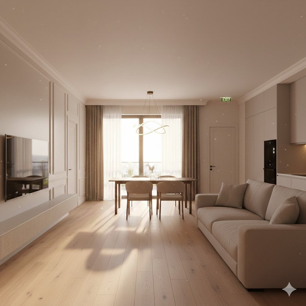 - Możliwość wykończenia pod klucz (wizualizacje przedstawiają potencjał aranżacyjny wnętrza w modnym stylu Modern Classic – ciepłe beże, sztukaterie i jasne drewno).