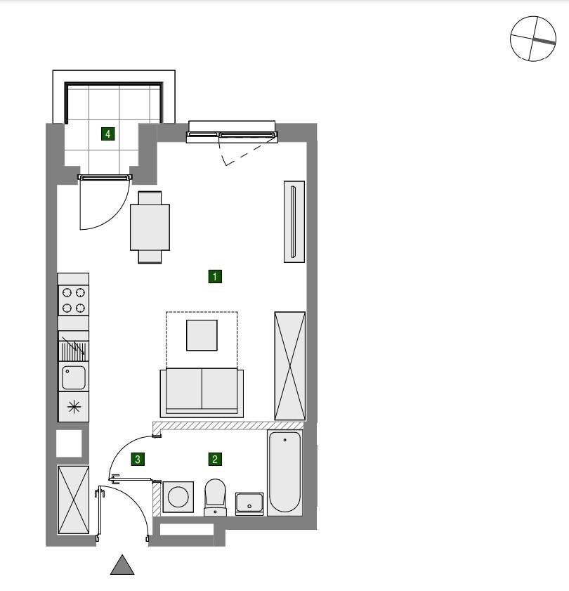 Mieszkanie to jednopokojowy lokal o powierzchni 34,23 m². Składa się z przestronnego salonu z aneksem kuchennym (25,66 m²), łazienki (4,87 m²) oraz przedpokoju (3,70 m²). Dodatkowo do mieszkania przynależy loggia o powierzchni 2,61 m².