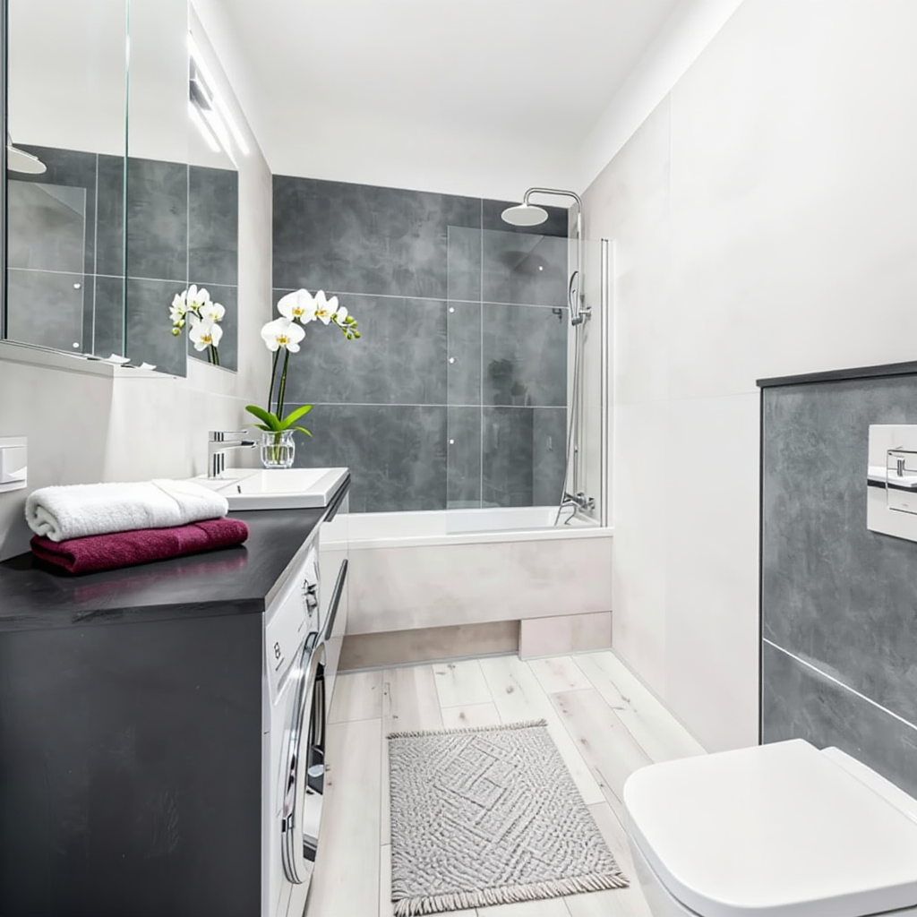 - Podłogi w pomieszczeniach: Panele, Gres