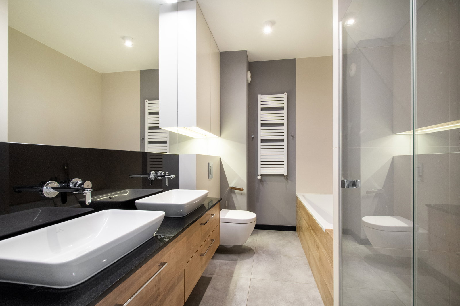 W łazience znajdziesz zarówno wannę, jak i oddzielny prysznic, dwie eleganckie umywalki oraz granitowe blaty – to przestrzeń, w której luksus spotyka się z funkcjonalnością. Dodatkowo do dyspozycji pozostaje osobne WC.