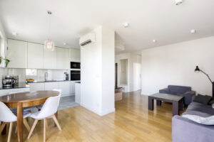 przestronny salon z otwartą kuchnią. Z salonu prowadzi wyjście na balkon okalający całe mieszkanie.
