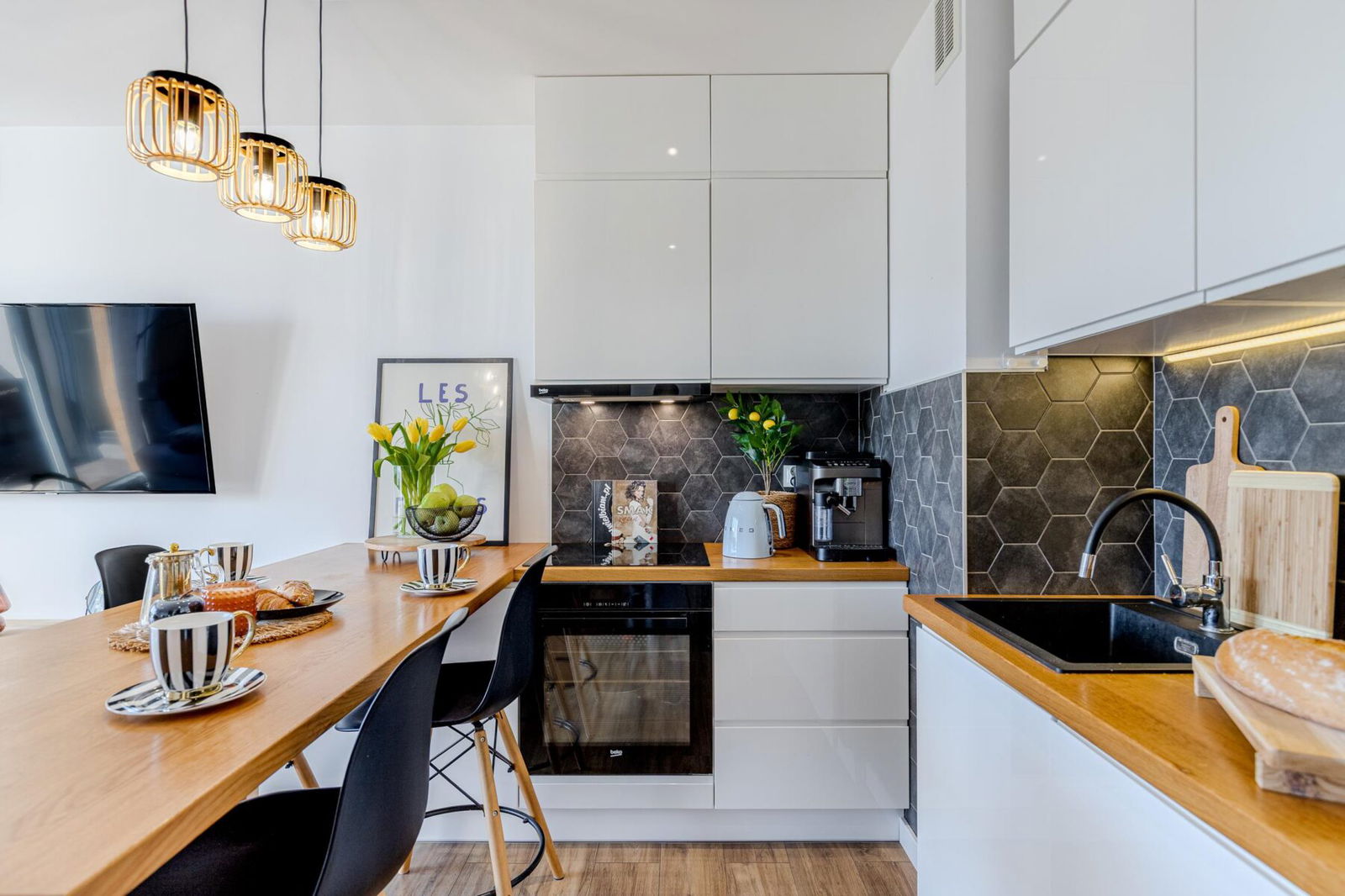 Tak, mieszkanie jest gotowe do zamieszkania i nie wymaga dodatkowych nakładów. Jest w pełni umeblowane i wyposażone w nowoczesne sprzęty, takie jak płyta indukcyjna Electrolux, piekarnik Beko, lodówko-zamrażarka Samsung, zmywarka Whirpool oraz okap Beko.