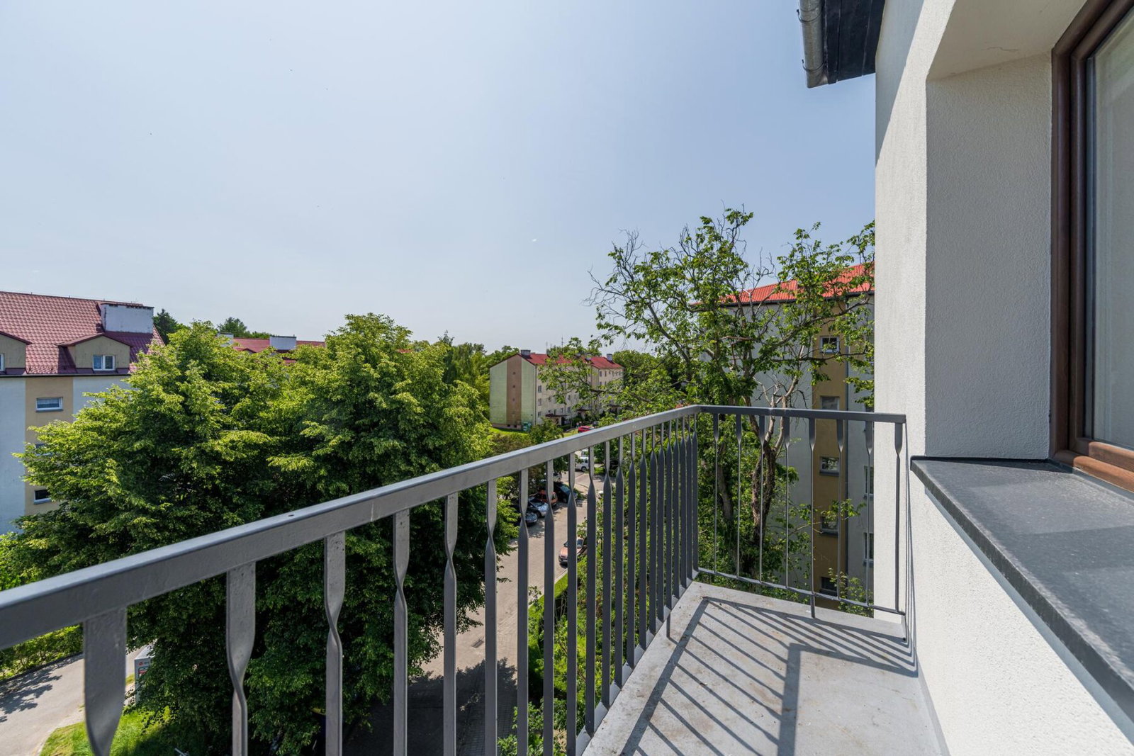 Przestronny balkon jest idealnym punktem widokowym na cichą okolicę