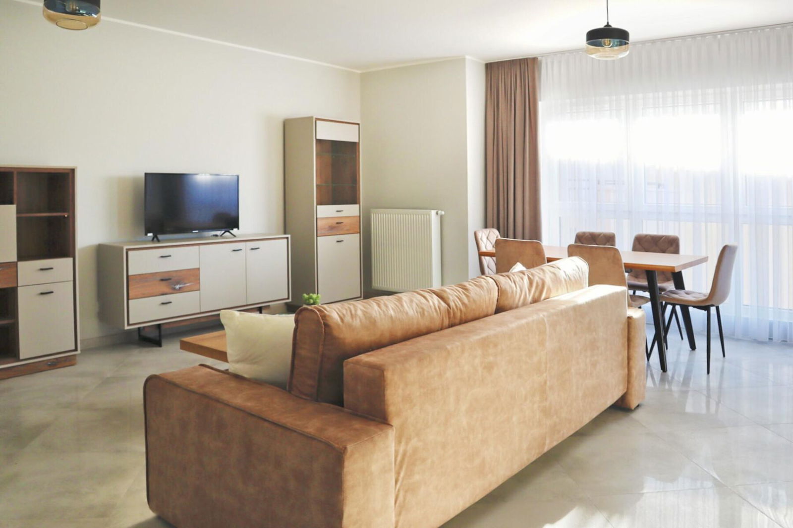 This apartment has been carefully designed with a modern lifestyle in mind, while maintaining the atmosphere of the Old Town of Elbląg. The spacious living room connects to the dining room, creating an open space ideal for family meetings or parties. Large windows provide plenty of natural light, and the sunny balcony is a perfect place for morning coffee or relaxing evenings.