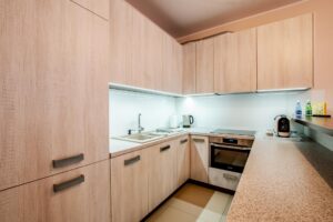 Oferowany lokal ma pow. około 56 m2, składa się z pokoju dziennego z aneksem kuchennym, sypialni, przedpokoju i łazienki z wc, oraz balkon. Wystawa okien od strony południowej. Do wykończenia lokalu zastosowano wysokiej jakości materiały wykończeniowe. Aneks kuchenny umeblowany i wyposażony w sprzęt AGD: płyta indukcyjna,okap, piekarnik z funkcją kuchni mikrofalowej, zmywarka, lodówka oraz wyposażenie: pełen serwis obiadowo-kawowo-deserowy wraz z kieliszkami, noże, komplet garnków, przybory kuchenne. W salonie zestaw mebli wraz z TV LCD i kanapa z funkcją spania. Przestronna łazienka z wc, umywalka, kabina prysznicowa oraz pralko- suszarka. Lokal wyposażony w nowoczesny klimatyzator, który szczególnie w upalne dni podnosi komfort mieszkania.