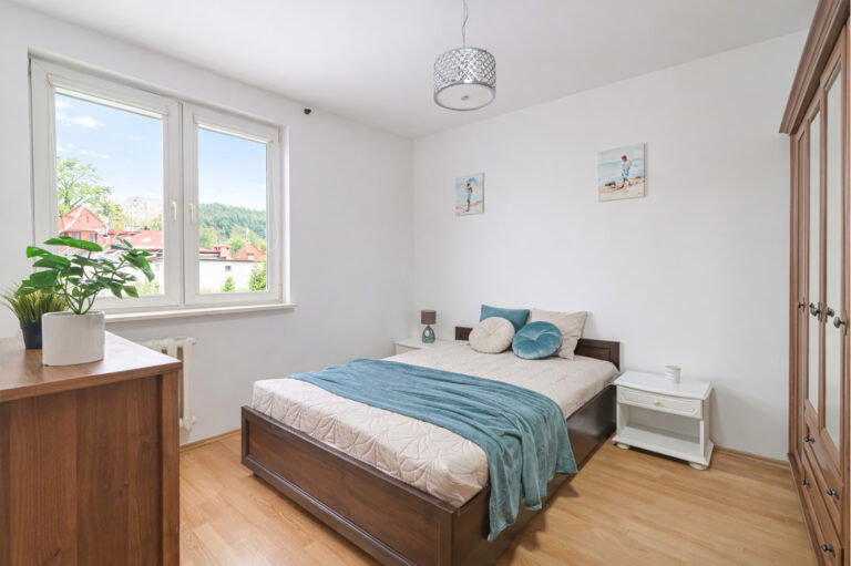 * przestronnego pokoju z pojemną szafą i wyjściem na francuski balkon,
