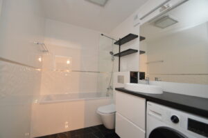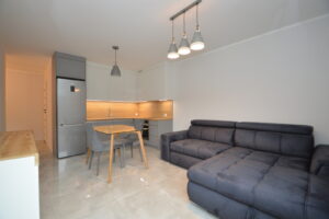 W skład mieszkania wchodzą: salon z aneksem kuchennym z wyjściem na balkon, sypialnia oraz łazienka. Mieszkanie jest umeblowane. W kuchni meble, kuchenka indukcyjna z piekarnikiem oraz lodówka, w łazience wanna, wc, umywalka oraz pralka automatyczna.