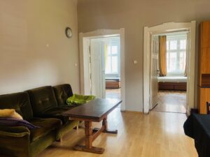 Mieszkanie usytuowane jest na wysokim parterze i składa się z 3 niezależnych pokoi o powierzchni 12,1 m2, 13,6 m2 oraz 19,8 m2 oraz dużego salonu z aneksem kuchennym o powierzchni 26,3 m2, które zostały wyposażone są w łóżka, meble oraz stoły z krzesłami.