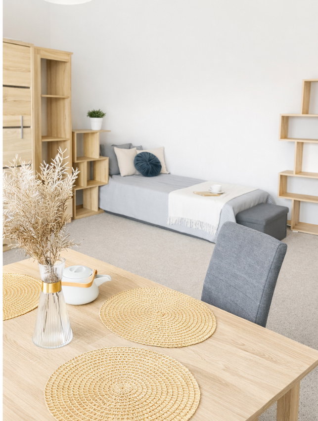 Jeden z pokoi, do którego wchodzimy z korytarza tuż po wejściu do mieszkania może być wykorzystywany na biuro, usługi bądź inną działalność gospodarczą. Jego położenie w mieszkaniu i bliska odległość od wejścia do budynku sprawią, że komfortowo będzie oddzielić część mieszkalną od części usługowej.