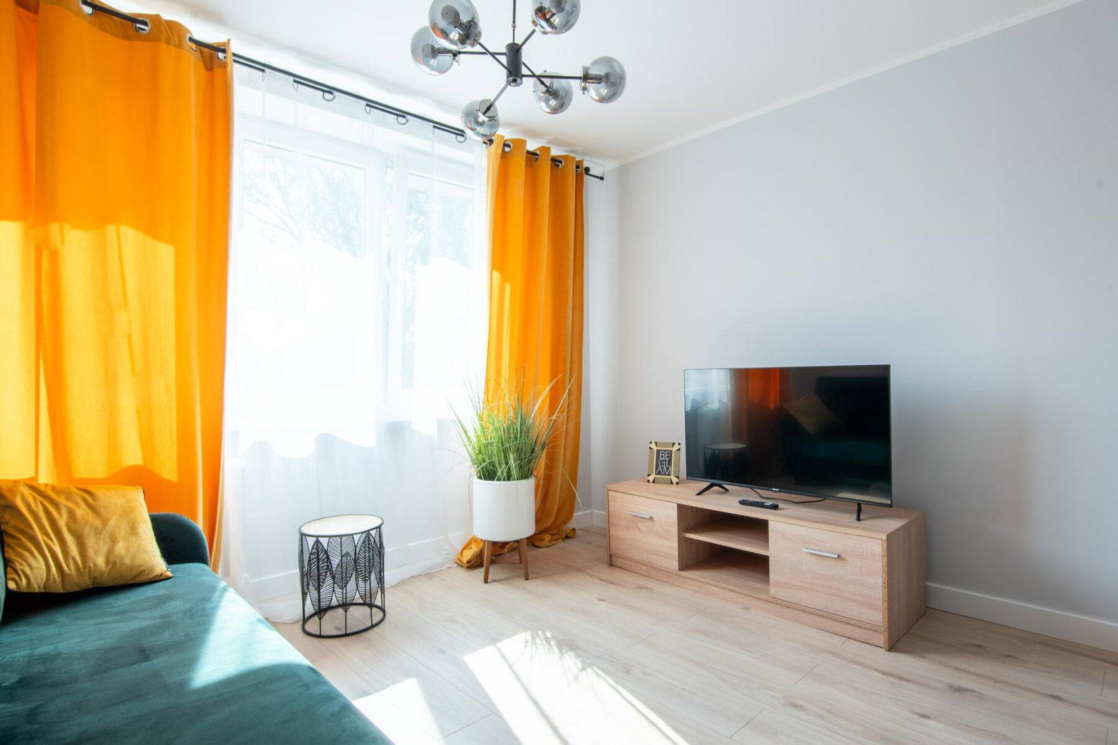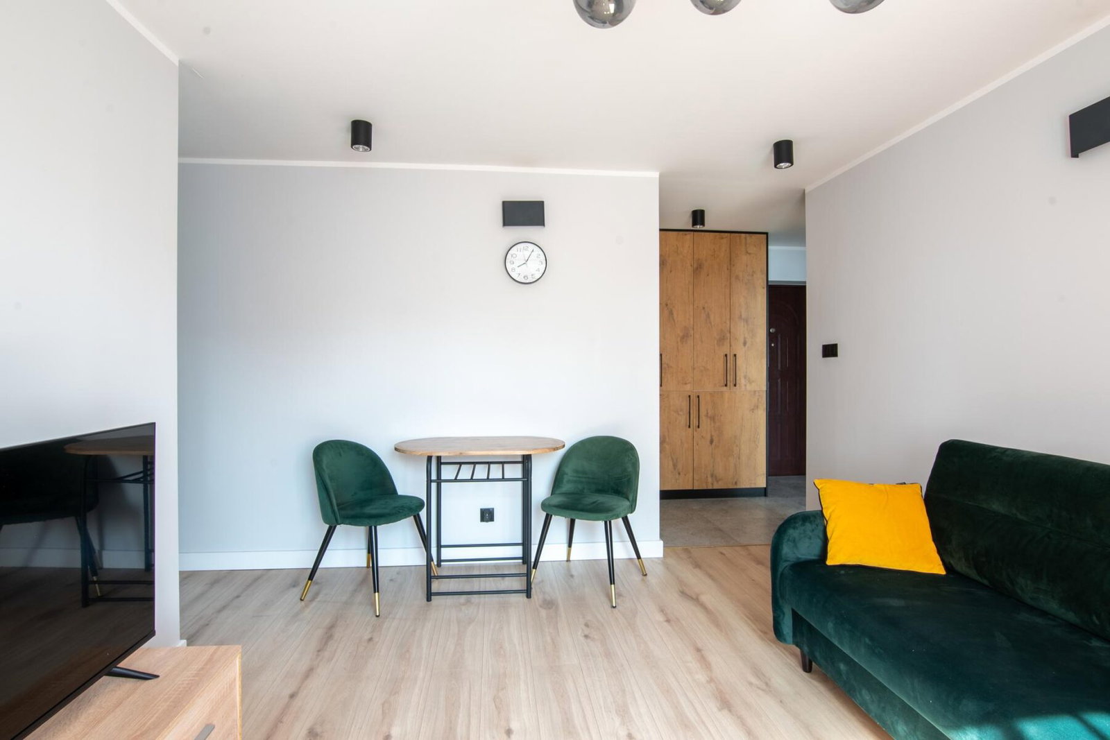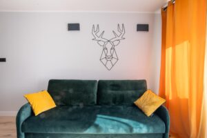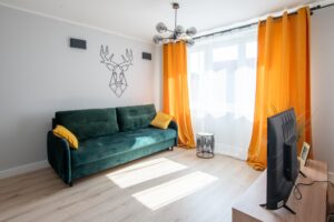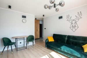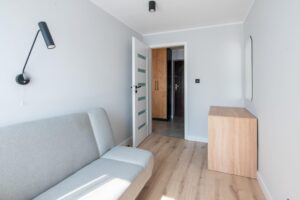 Mieszkanie jest w pełni umeblowane i gotowe do zamieszkania. W salonie m.in rozkładana kanapa, stół, krzesła, stolik kawowy, komoda, TV.W sypialni wygodne łóżko dwuosobowe. W pokoju rozkładana kanapa. Kuchnia w zabudowie wyposażona w sprzęt AGD: lodówkę z zamrażarką, płytę indukcyjną, piekarnik elektryczny, okap. Przedpokój zaprojektowano jako miejsce do przechowywania. Zabudowa szaf mieści też pralkę.
