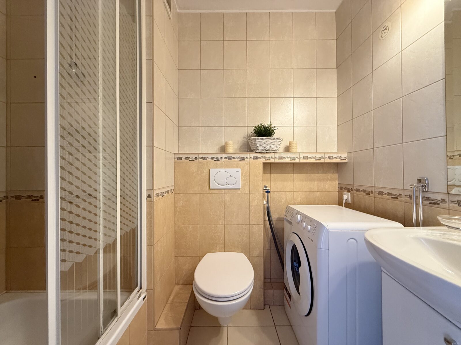 Na powierzchni 38,6 m2 znajduje się przestronny pokój z kuchnią w aneksie o pow. 15,24m2, sypialnia z balkonem 14,95m2, łazienka z wc 2,99m2 oraz przedpokój 5,45m2. W kuchni znajdują się meble wraz z AGD (lodówka, kuchenka, mikrofalówka, okap), a w łazience pralka. Na podłogach w pokojach znajduje się mozaika parkietowa, a w kuchni i w łazience płytki. Do mieszkania przynależy piwnica.