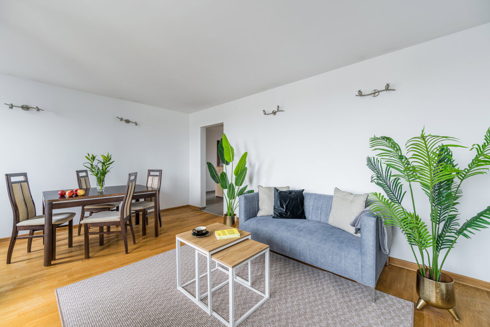 Salon: nowa kanapa stół jadalny, telewizor, parkiet.