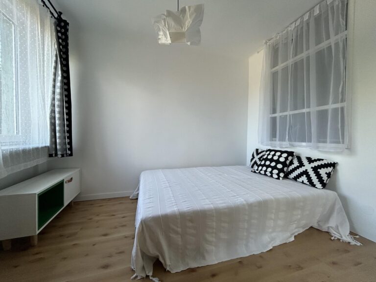 - Sypialnia II (9 m²) – doskonała jako druga sypialnia, pokój do pracy lub gabinet; wyposażona w łóżko, biurko i regał.