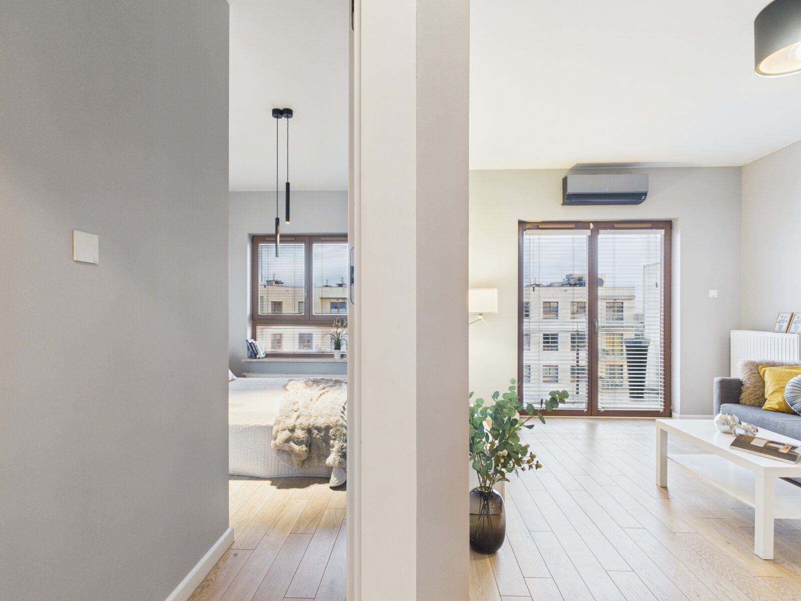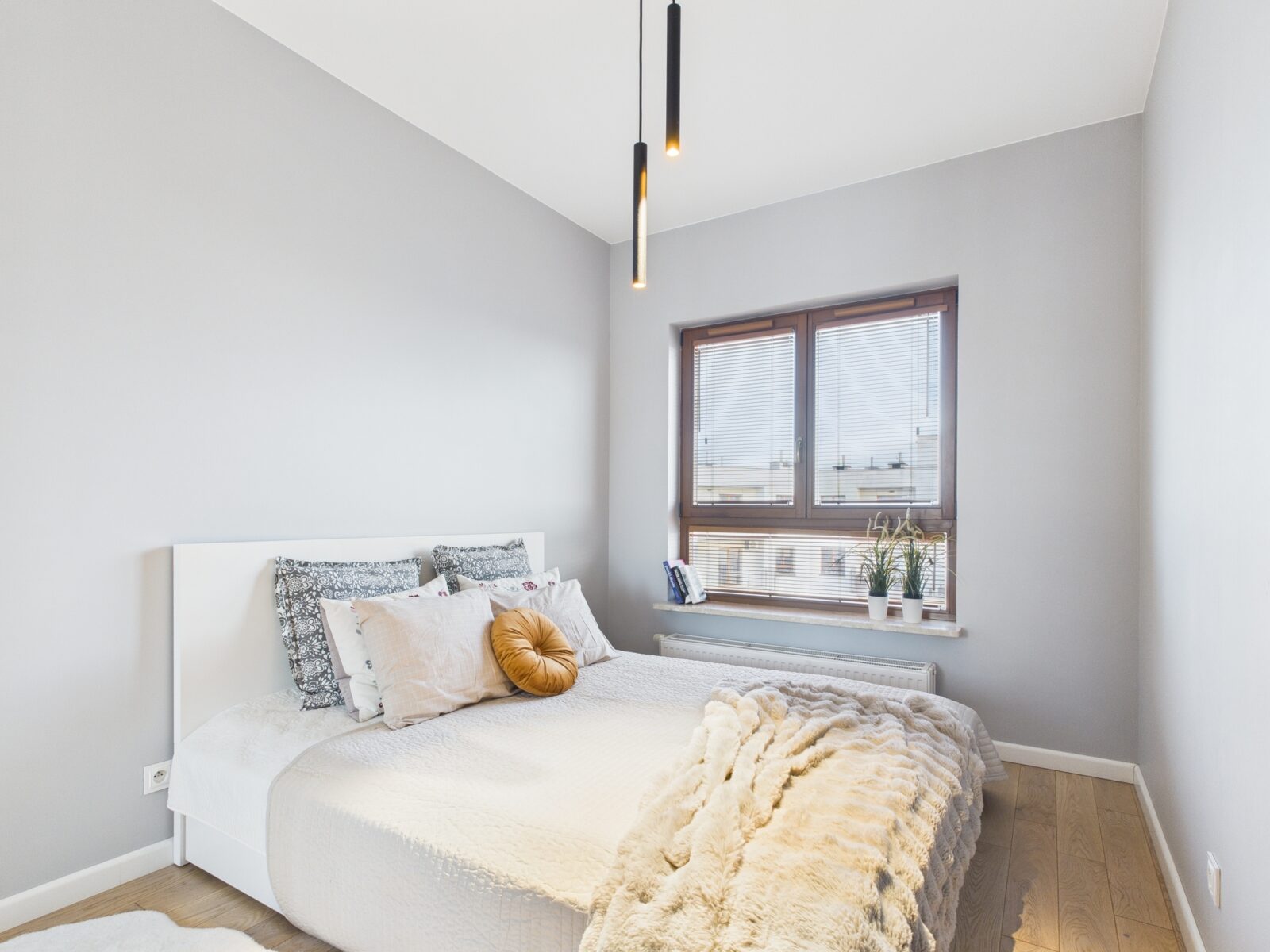 Na podłodze parkiet. Duże, panoramiczne okna.