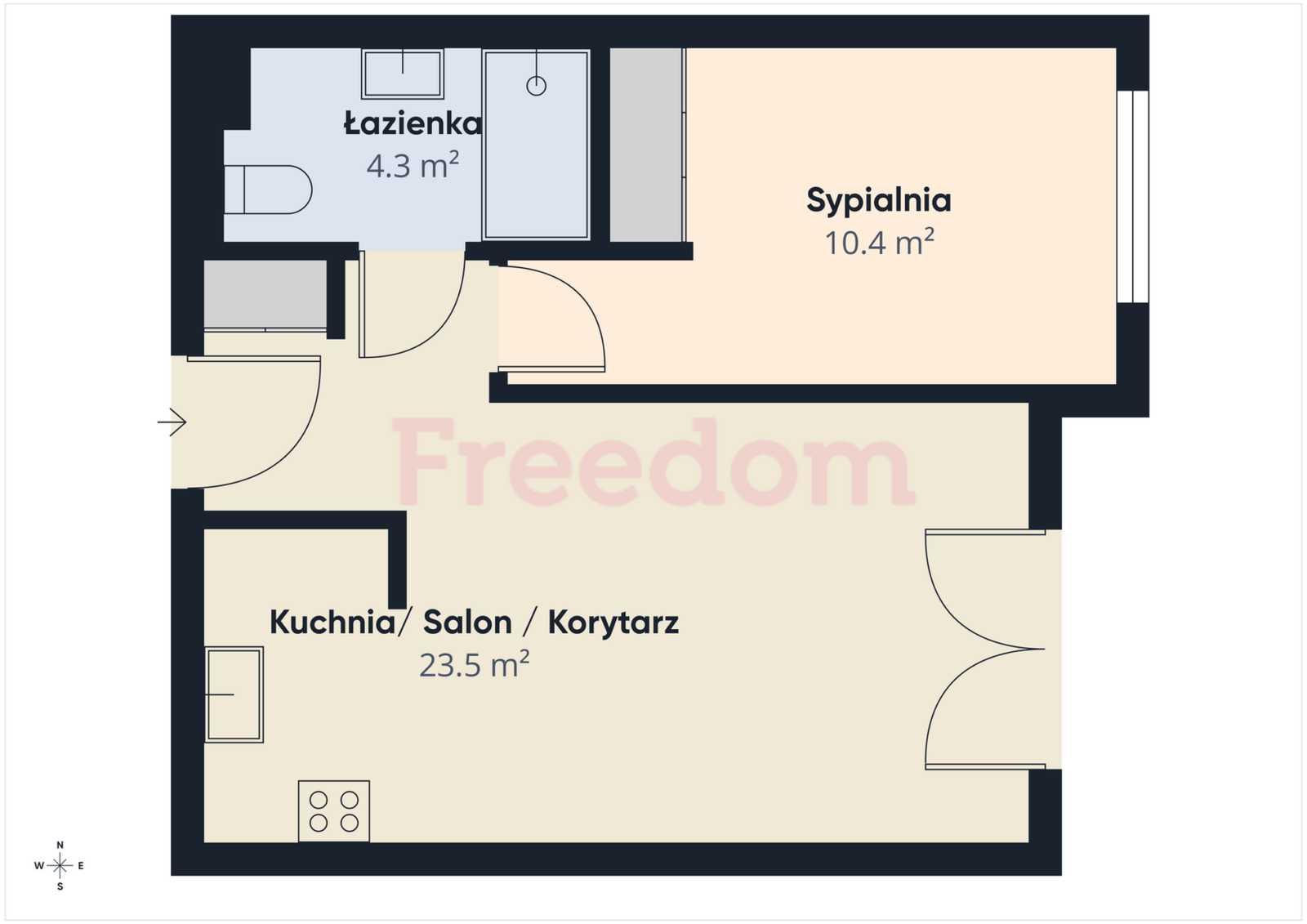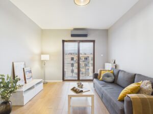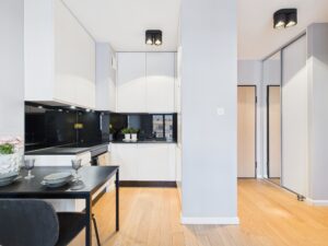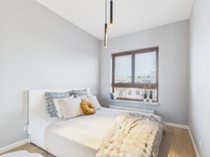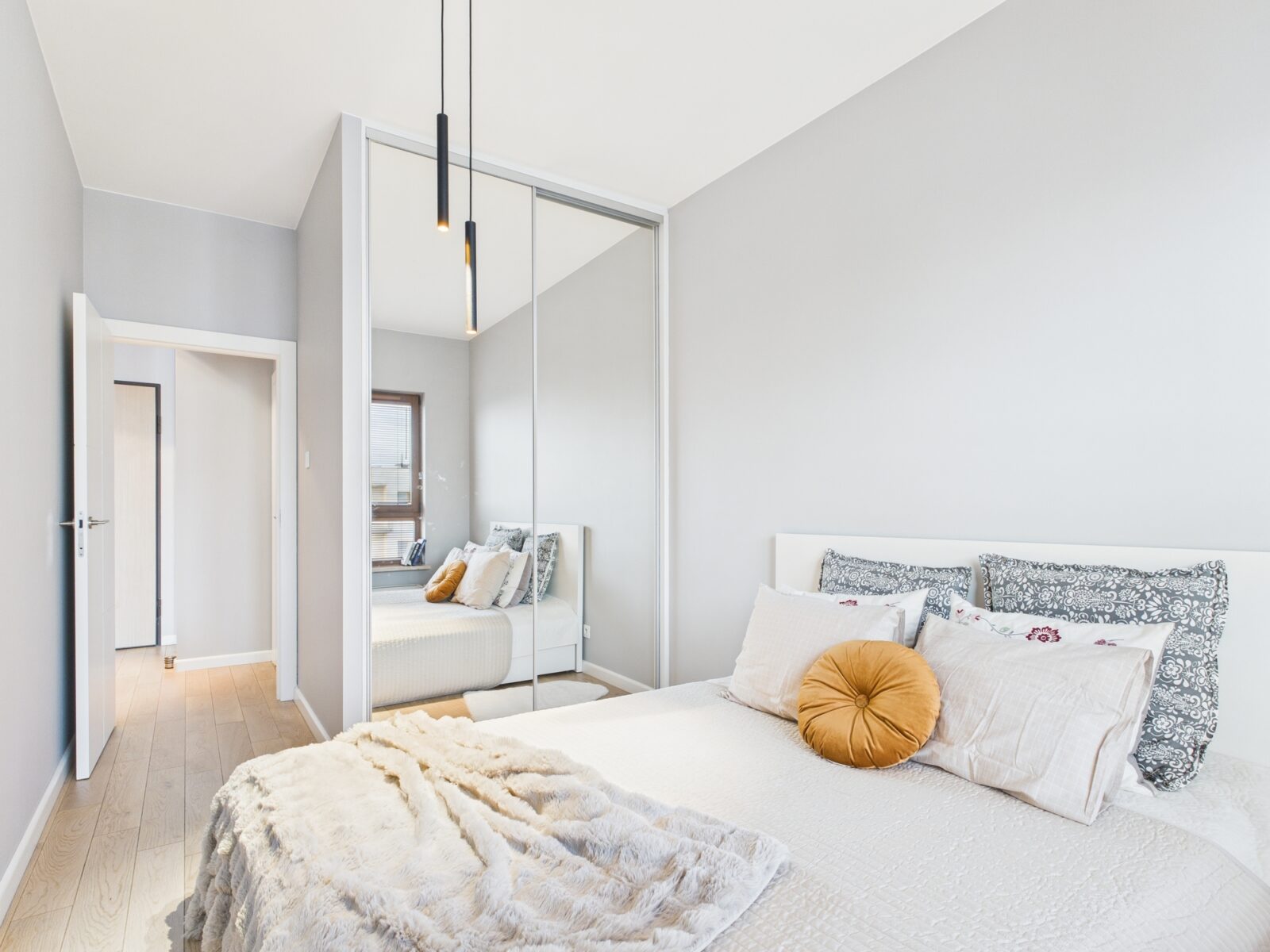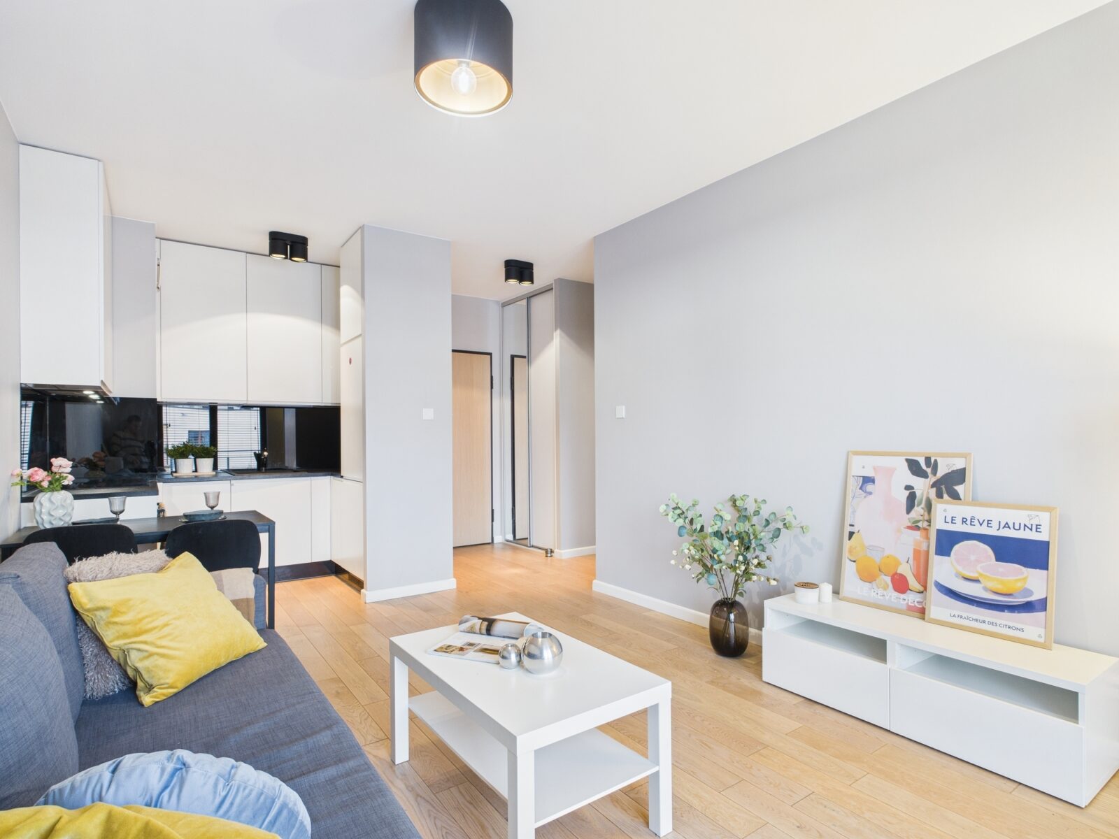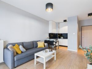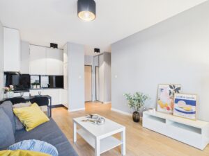 Mieszkanie ma 40 m2 i składa się z dwóch pokoi: salonu z aneksem kuchennym oraz sypialni z dużym łóżkiem.