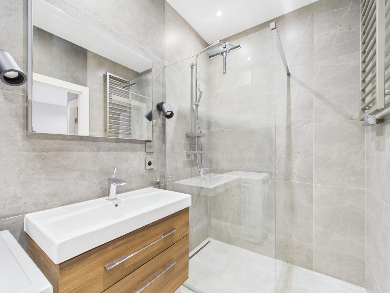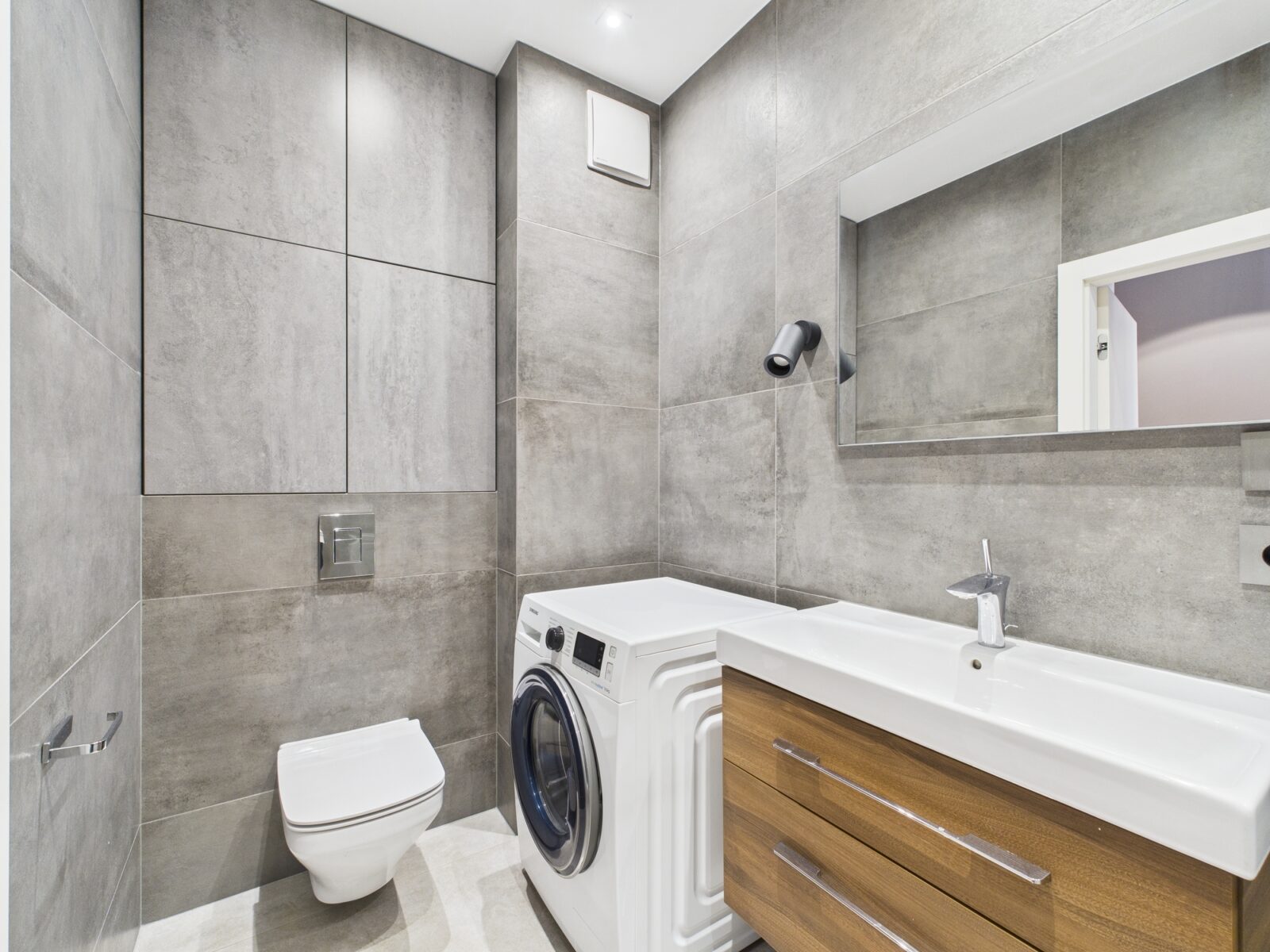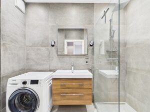 Łazienka z wygodną kabiną prysznicową i nową pralką.